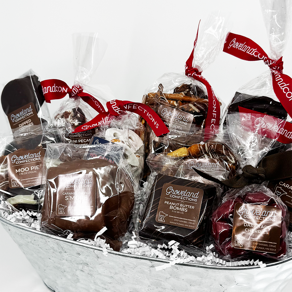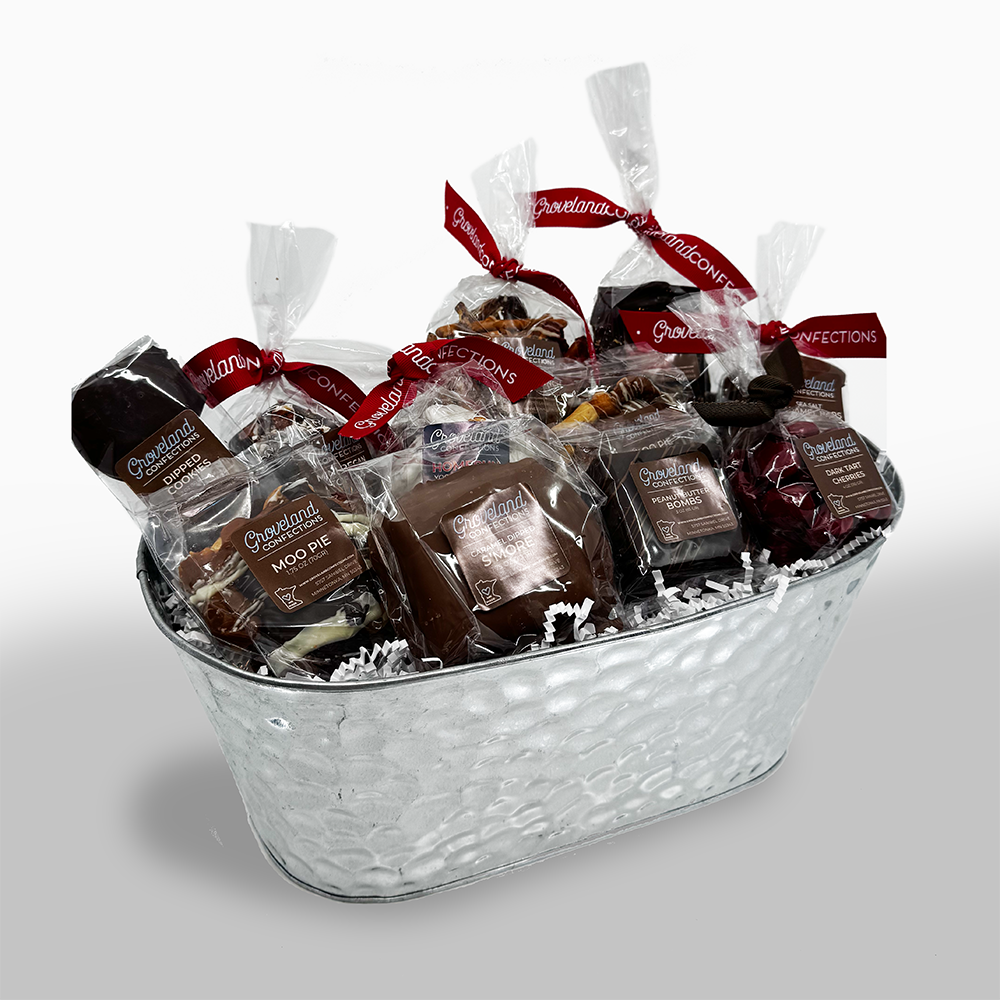 This beautiful silver hammered finish container holds our best selection of confections for the holidays. The perfect gift for the holiday season. (Includes a combination of around 15 of our best treats!)